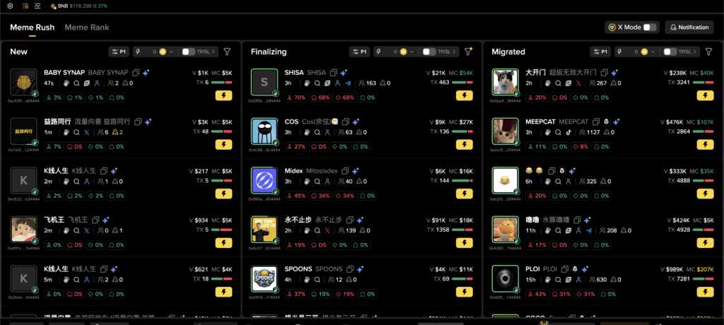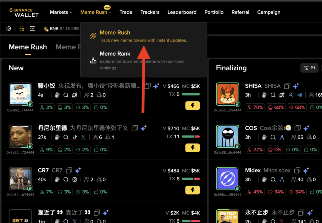 MemeRush is an interface on Binance Wallet that allows you to instantly view new tokens launched on the Solana and BSC networks and trade them immediately. With this interface, you can buy tokens at very low market caps and manage all your transactions through a single dashboard.