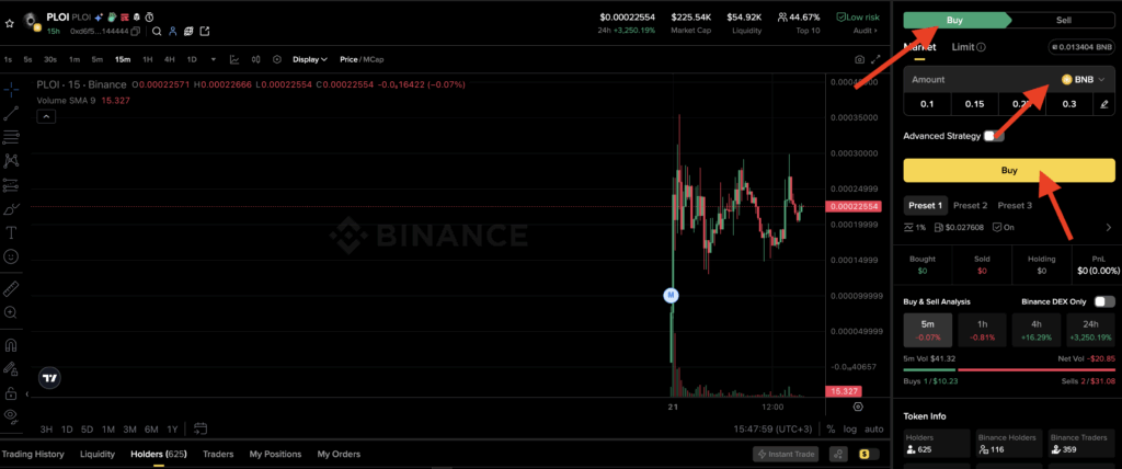 - Select the amount of BNB you want to use for the purchase.