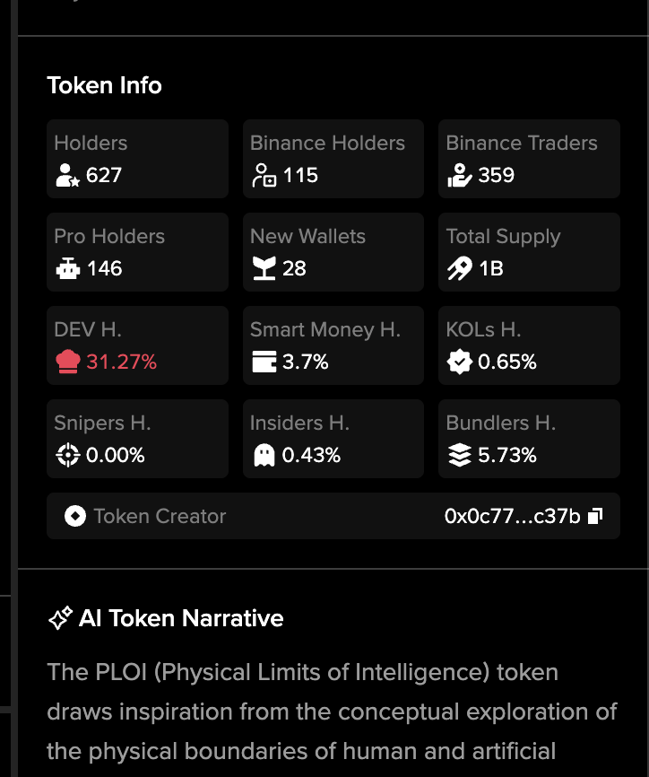 When you scroll down the menu on the right side, you will find the “Token Info” section. In this area, you can see the number of holders, how many people are holding the token on Binance, the number of new wallets, and the number of pro wallets.